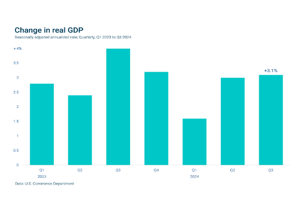 - GDP rose at a 3.1% annualized rate in the 3rd quarter. This marked the strongest rate of quarterly expansion of the year, driven by consumer spending and government outlays.